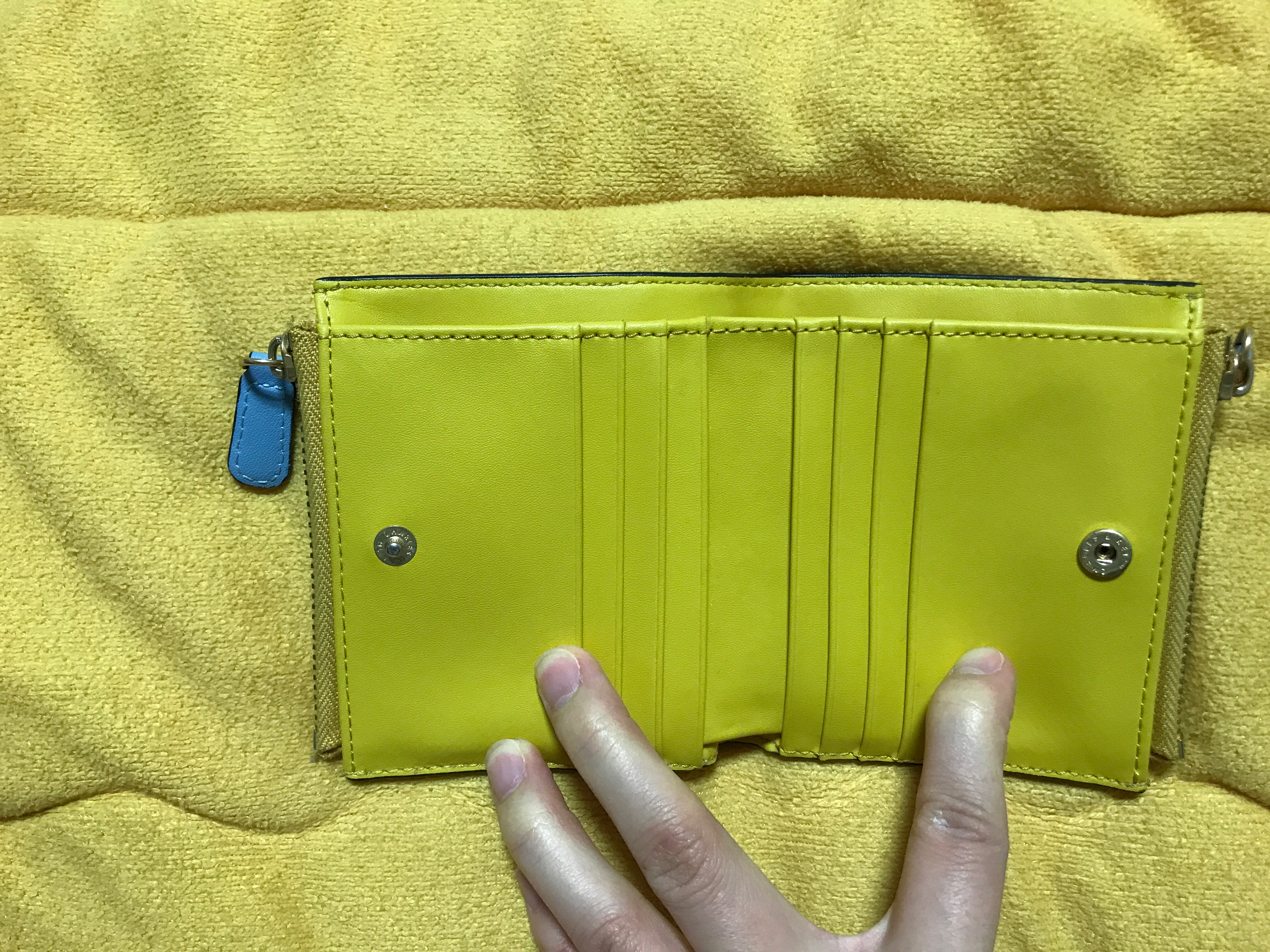 지갑은 똑딱이 형식으로 여닫고, 열면 안에는 겨자색에 가까운 컬러의 가죽으로 대져있음